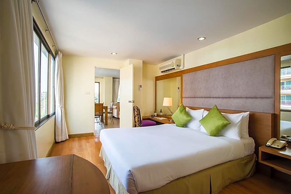 Features views of Pattaya Bay, a glass-walled bathroom and a sofa set.